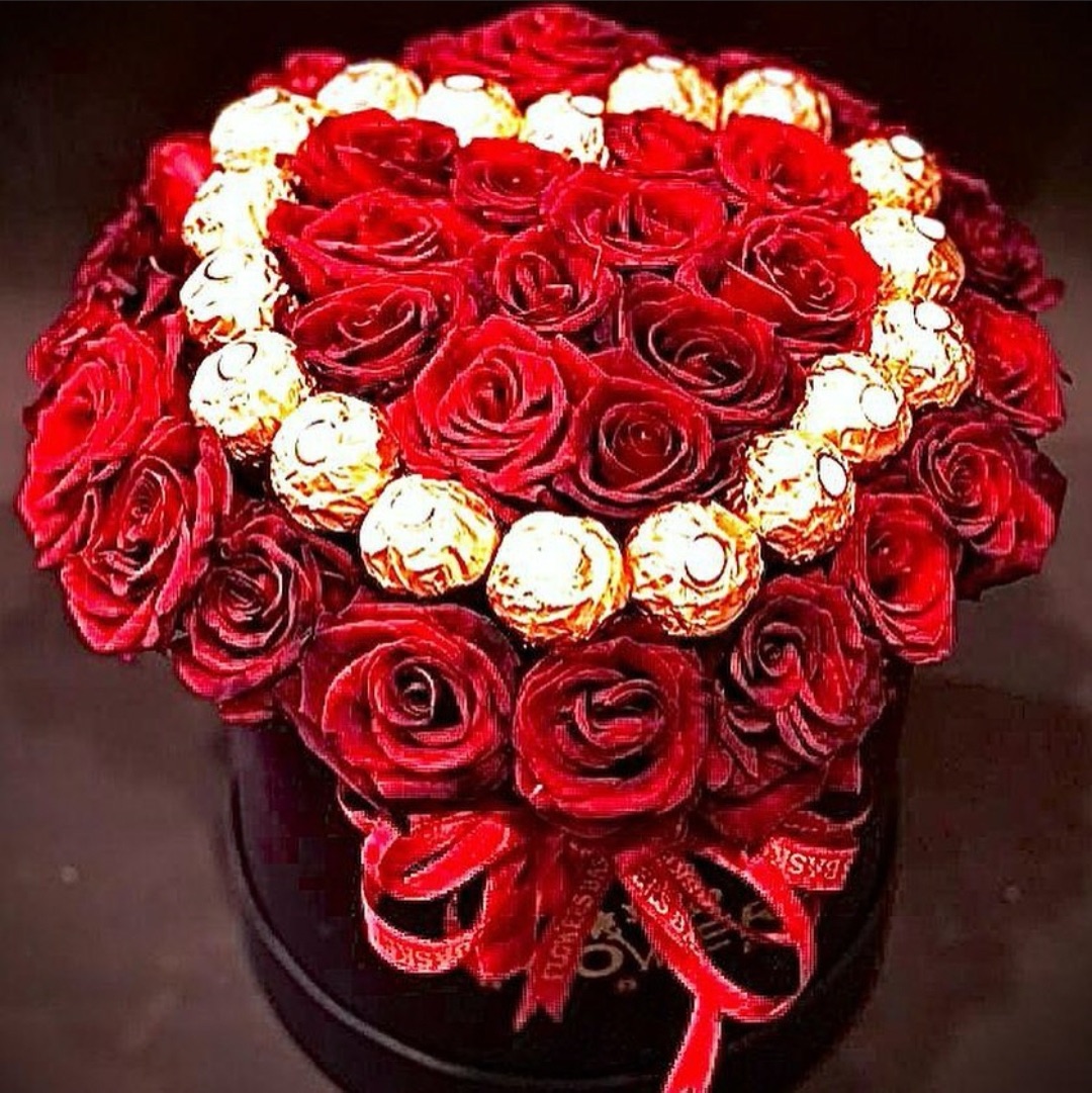 Box with red roses & chocolate